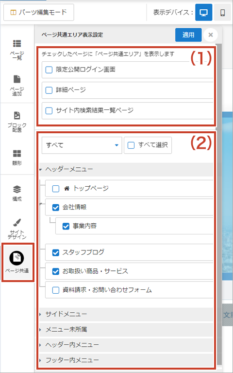 (2) サイト内に作成されているページ名が表示され、チェックボックスで選択したページに共通エリアが表示されます。