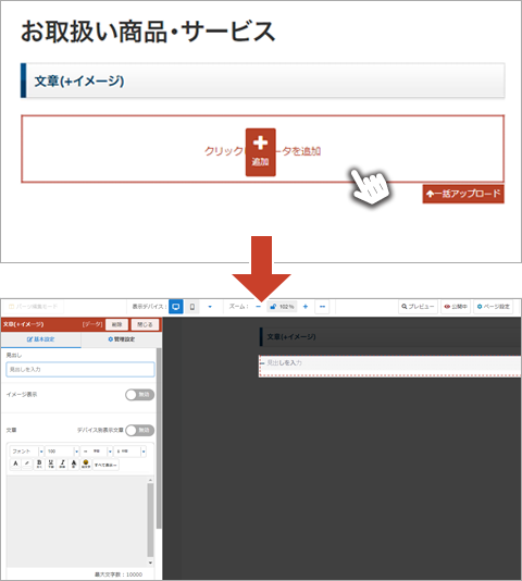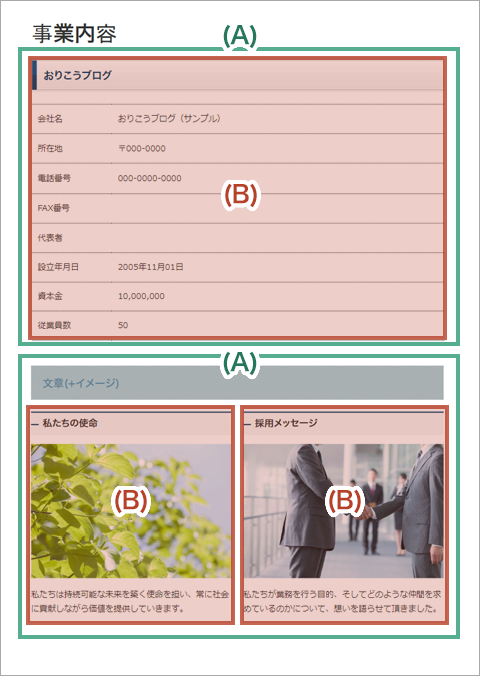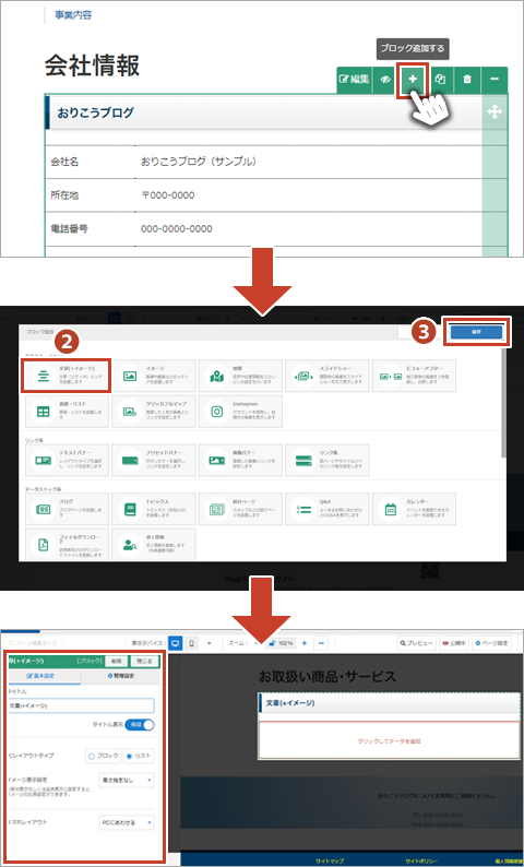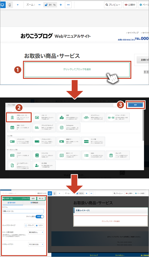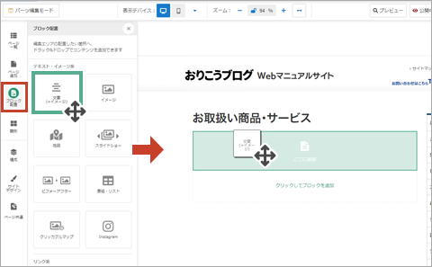 ブロック配置 ブロック・データについて おりこうブログでページのコンテンツを作成するには、(A)ブロック (枠) を設置して、その中に(B)データ(情報)を入力して編集を行います。ブロックは、データを表示するための枠組みとなっているため、ブロック追加後は必ずデータ(情報)を入力して、ホームページを充実させましょう。*一度設定したブロックタイプは、後から別のブロックタイプに変更することはできません。 [非表示]1.ブロック追加方法ツールバーから追加エリア上から追加2.ブロックタイプ一覧3.データ追加方法エリア上から追加ブロック追加方法 ページを新規追加後、ページ内に「クリックしてブロックを追加」と表示されます。クリックすると【ブロック追加】の画面が表示されますので、追加したい種類のブロックをクリックで選択します。右上にある「保存」ボタンをクリックすると、ページ内にブロックが追加されて編集パネルが表示されます。 ツールバーから追加 ツールバーにある「ブロック追加」ボタンをクリックすると、"ブロック追加"パネルが表示されます。追加したい場所に、ブロックタイプのアイコンをドラッグ&ドロップで設置します。 エリア上から追加 ページ内にブロックが配置されている場合に、ブロックのコンテンツ上にカーソルを重ねると、ブロック操作パネルが表示されます。編集パネルの「ブロックを追加する」ボタン(+マーク)クリックすると【ブロック追加】の画面が表示されます。追加したい種類のブロックをクリックで選択します。右上にある「保存」ボタンをクリックすると、ページ内にブロックが追加されて編集パネルが表示されます。 ブロックタイプ一覧 各ブロックタイプの詳細については、下記からご確認ください。 テキスト・イメージ系文章(+イメージ)/イメージ/地図/スライドショー/ビフォーアフター/表組・リスト/インスタグラム/クリッカブルマップリンク系テキストバナー/プリセットバナー/画像バナー/リンク集データストック系ブログ/トピックス/紹介ページ/Q&A/カレンダー/ファイルダウンロード/求人情報その他フォーム/準備中/サイトマップ/デジタルカタログ/HTMLタグ/自由配置/目次/関連情報表示オプションオプション(不動産物件)賃貸/売買(不動産)/条件検索(不動産)kintone連携機能リスト表示/ブロック表示/カレンダー表示/レコード表示/グラフ表示/Myページその他自動車紹介/条件検索(自動車紹介)/インナー掲示板データ追加方法 ブロックを追加後、ブロック内に「クリックしてデータを追加」が表示されます。クリックするとデータの追加が行えます。 エリア上から追加 既に追加されているデータのコンテンツ上にカーソルを重ねると、操作パネルが表示されます。操作パネル内の【データ追加】ボタン(+マーク)をクリックすると、下部にデータが追加されます。