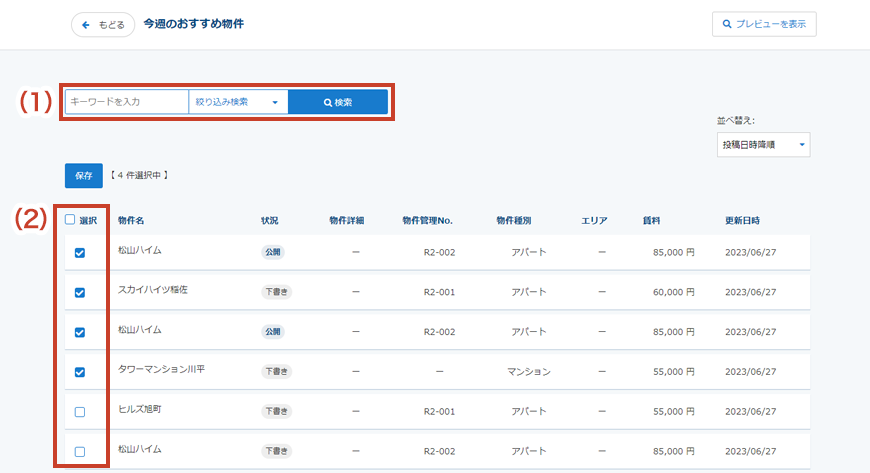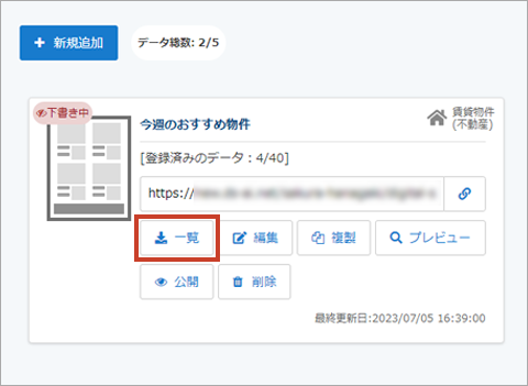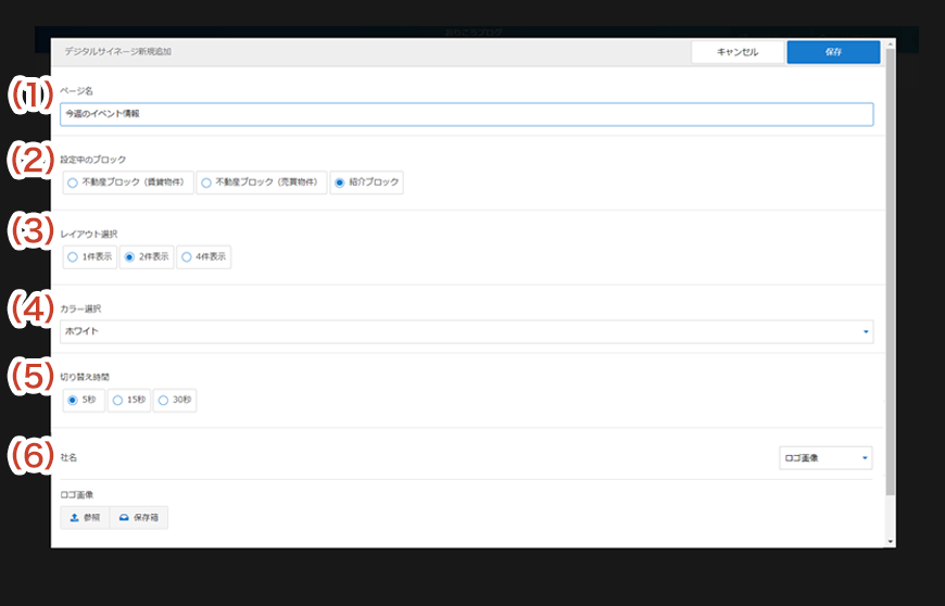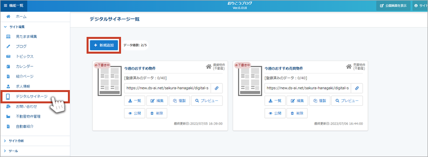 連携ページの新規追加/データの登録方法 おりこうブログ内特定のデータを電子広告として表示するには、デジタルサイネージ連携用のページを新しく作成し、登録を行う必要があります。 新規登録方法①ページの新規追加 画面左上にある【メニュー一覧】から、デジタルサイネージのページ一覧画面を表示します。一覧画面を表示後、左上の(1)【新規追加】ボタンをクリックしてください。 ②表示ブロックの登録と表示設定 新規追加ボタンをクリック後、ページの設定画面が表示されます。(1)ページ名 …… 表示させるページ名を入力します。(2)表示するブロック …… 表示するブロックを選択し、サイト内で選択したブロックのデータが登録されます。(3)レイアウト選択 …… データの表示数を選択します。(4)カラー選択 …… カラーを選択します。(5)切り替え時間 …… データを切り替える時間を選択します。(6)社名 …… 社名を表示したい場合に設定します。設定後、右上の【保存】ボタンをクリックすると、ページの作成が完了します。 ③データの表示設定 ページの新規追加完了後、一覧画面へ作成したデータが表示されます。続いて、データの表示設定を行うため、【一覧】ボタンをクリックします。 一覧画面では、ページ追加時に選択したブロックタイプへ作成済みの ”すべてのデータ” が表示され、物件情報が確認できます。特定のデータから表示選択を行う場合は、(1)絞り込み検索 でキーワードやブロック名等を選択し、表示設定を行います。表示されたデータから(2)選択 にチェックし、デジタルサイネージで表示するブロックを選択してください。選択後、左上の【保存】ボタンをクリックしてください。以上で、ページの新規追加/表示データの登録は完了です。選択したコンテンツをサイネージで表示する連携方法については、詳しくは下記をご確認ください。 デジタルサイネージの連携方法