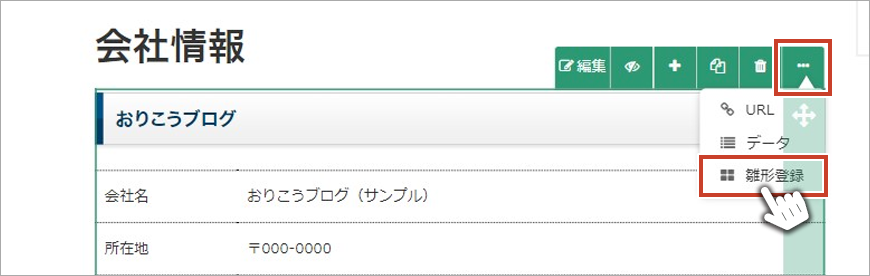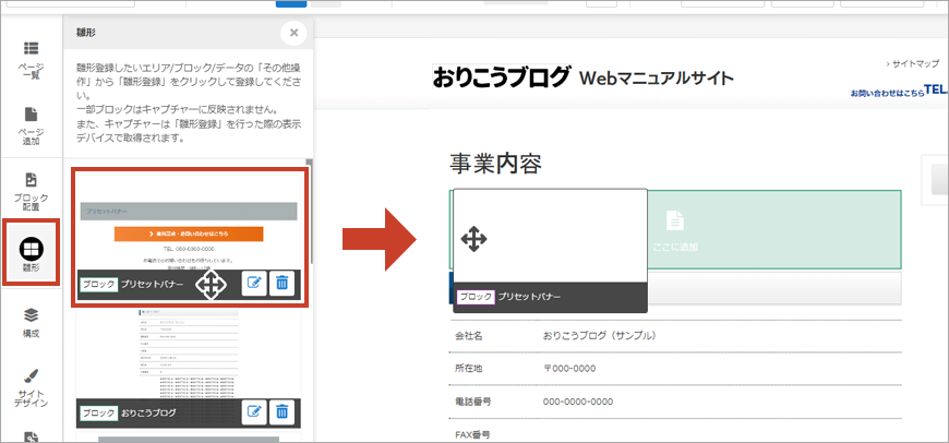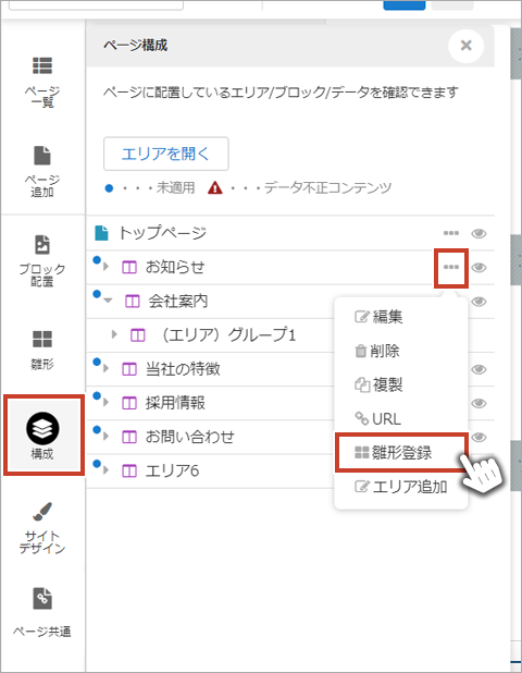 雛形機能 雛形とは 「雛形」機能とは、ブロック/データ/エリアを雛形として登録し、異なるページに複製できる機能です。複数のページに連続して設置することも可能です。 操作方法ブロック・データの雛形登録 雛形として登録したいブロックやデータにマウスカーソルを重ねて、操作パネルの「その他の操作」をクリックします。表示されるメニューの「雛形登録」をクリックして、ブロック、データが登録されます。 エリアの雛形登録 ツールバーの「ページ構成」の操作パネルを開き、複製したいエリアの三点リーダー(…)をクリックします。表示されたメニューの「雛形登録」をクリックするとエリアの登録が行えます。 雛形の配置 配置したいのページで、ツールバーの "雛形" を開き、パネル内の ブロック/データ/エリア をドラッグ&ドロップで配置して完了です。*データは、雛形登録されているブロックタイプと、複製先のブロックタイプが同じ場合に配置できます。*ブロック・データ・エリア以外では、雛形機能を使用することができません。(パーツのデータは対応しておりません。)