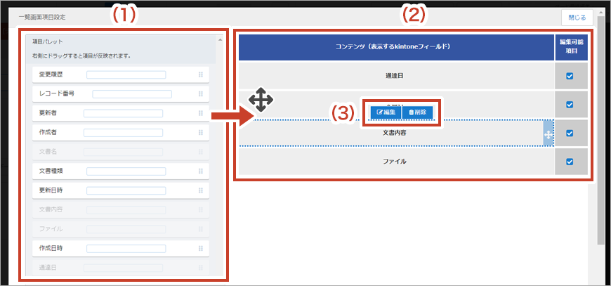 (1)「項目パレット」には、連携させたアプリに紐づく項目が一覧で表示され、(2)「コンテンツ」にドラッグ&ドロップして追加することができます。