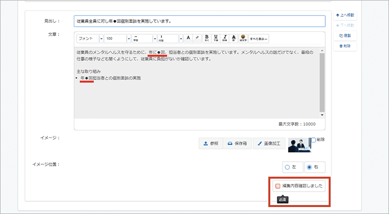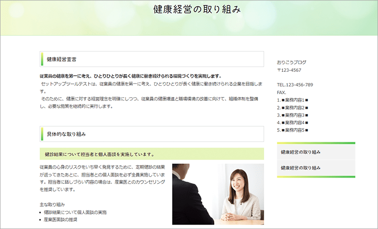 例文や画像が予め設定されている「取り組み例」を選択し、健康経営の取り組み内容を簡単に作成できる機能です。