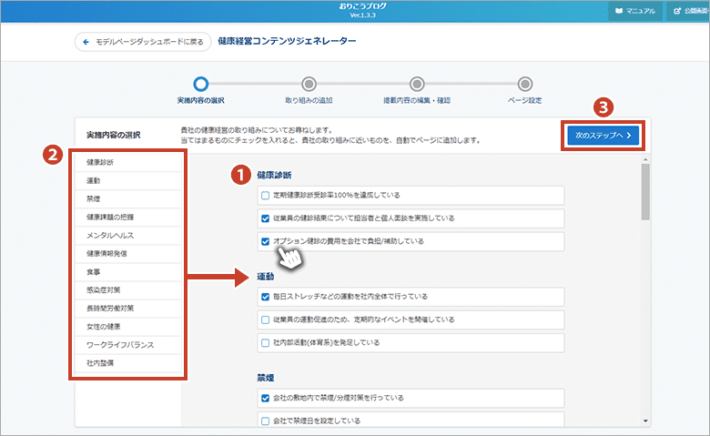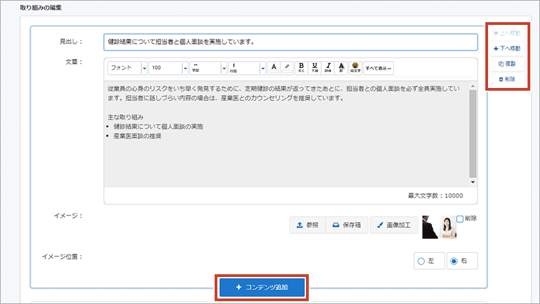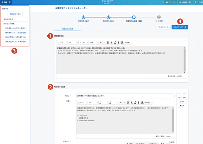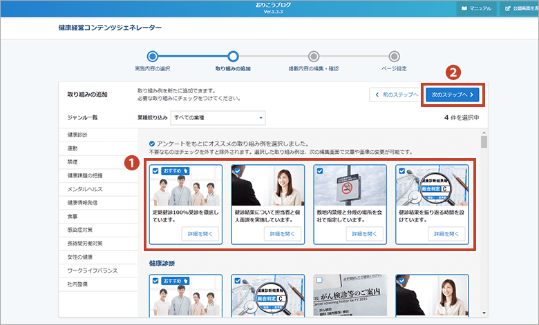 実際の取り組み内容をもとに、おすすめの取り組みをご提案したり、様々な取り組み例から選択して掲載内容の編集を行うことができます。