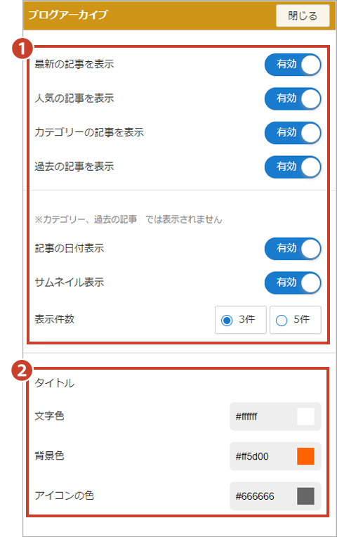 ブログタイトルを表示する文字色、背景色の設定や、記事の開閉アイコンの色の設定を行えます。