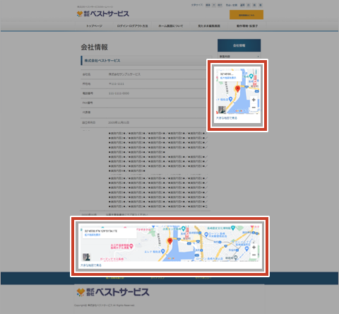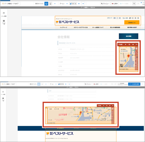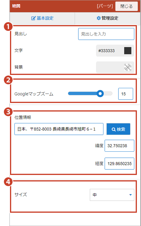 地図パーツ パーツ解説 配置可能エリア/サイドエリア、ボトムエリアサイドエリア、ボトムエリアにGoogleマップを表示できます。 パーツ編集モードについてはこちら パーツ編集モードで地図パーツ部分にマウスカーソルを合わせると、操作パネルが表示されます。操作パネルから、編集、データの追加、複製、削除、下書き・公開の切り替え が行えます。 データ編集 ①見出し見出しを表示させる場合に入力します。また、文字色や背景色が設定可能です。②Googleマップズームマップのズーム値を変更できます。③位置情報住所入力や緯度・経度を設定し、地図の表示を行います。④サイズ地図のサイズを大、中、小から選択します。