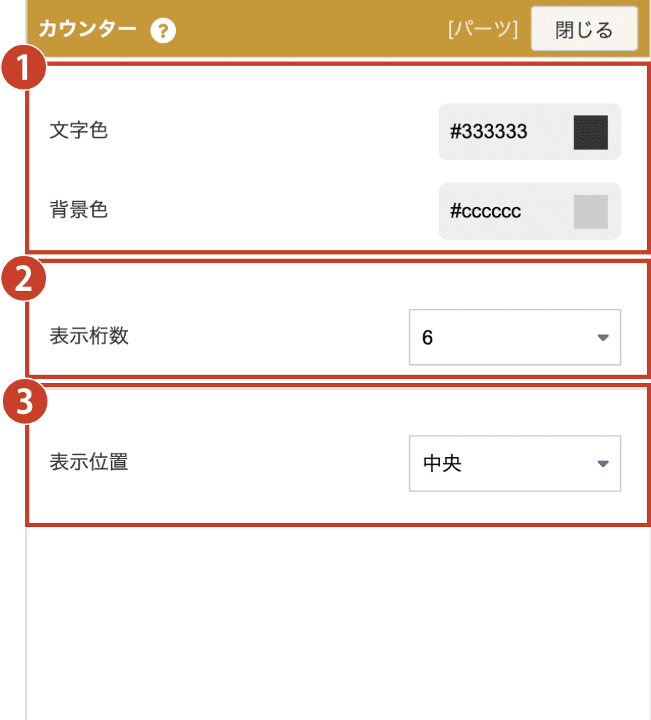 カウンターパーツ パーツ解説 配置可能エリア/サイドエリア、ボトムエリアカウンターパーツは、ホームページに何回アクセスされたかをカウントするパーツです。アクセス数は"セッション数"でカウントされます。 パーツ編集モードについてはこちら パーツ編集モードでカウンターパーツをクリックすると、パーツ編集パネルが表示されます。 パーツ編集 ①文字色・背景色文字の色、背景の色を変更できます。②桁数カウンターの桁数を”5~9”桁の間で選択します。アクセス数が桁数を超えた場合は、自動で1桁増えます。③表示位置カウンターの表示位置を左、中央、右から選べます。