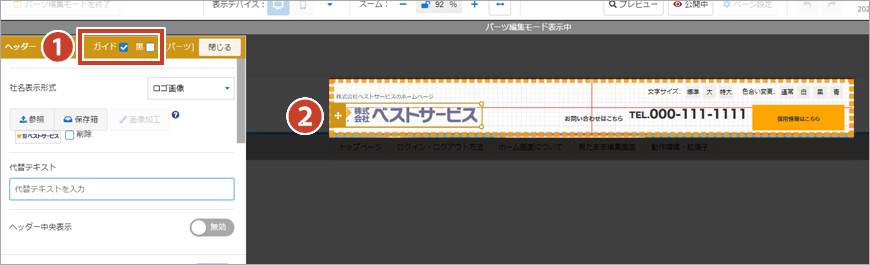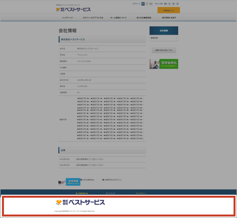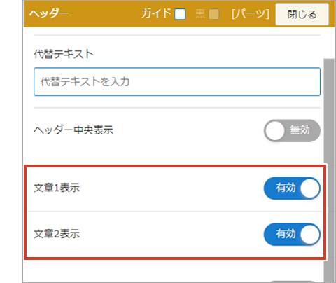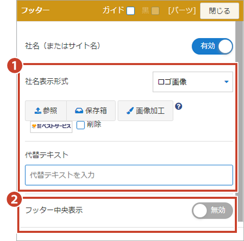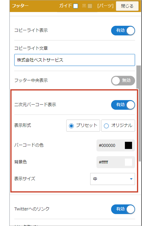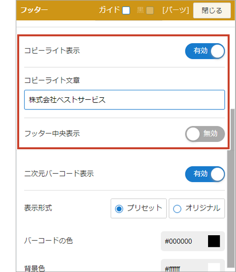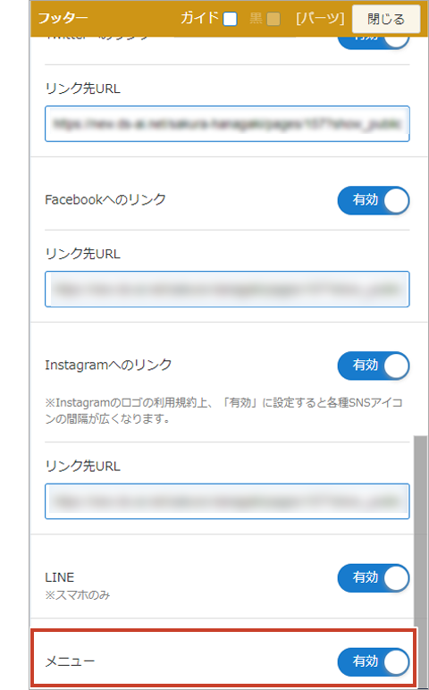 メニューの設定を"有効"にすると、フッター内メニューを表示します。