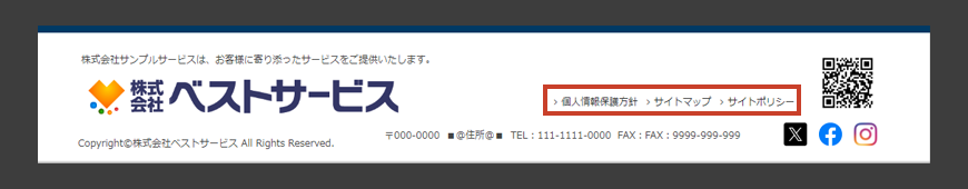 フッター内メニューに表示されるページは、予め "ページ一覧" の「フッター内メニュー」の階層に登録している必要があります。