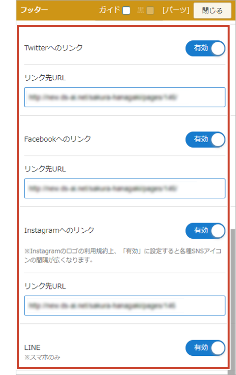 リンクさせたいSNSを"有効"にしてリンク先のURLを入力します。