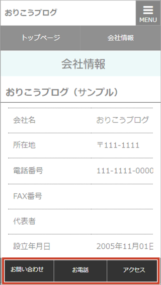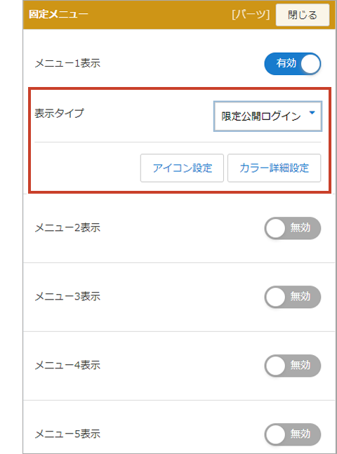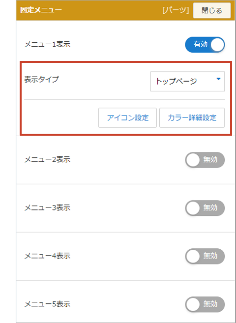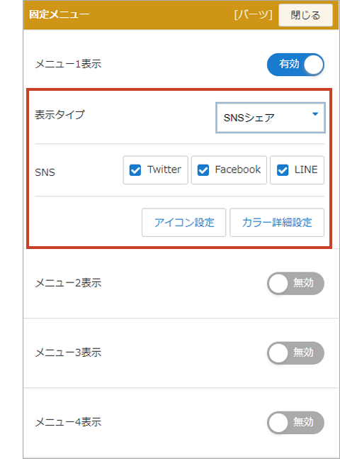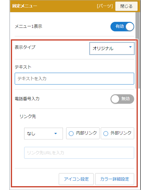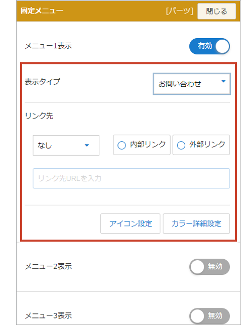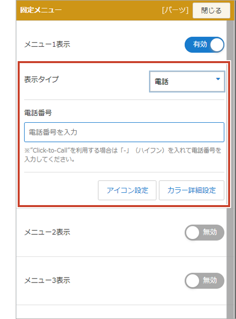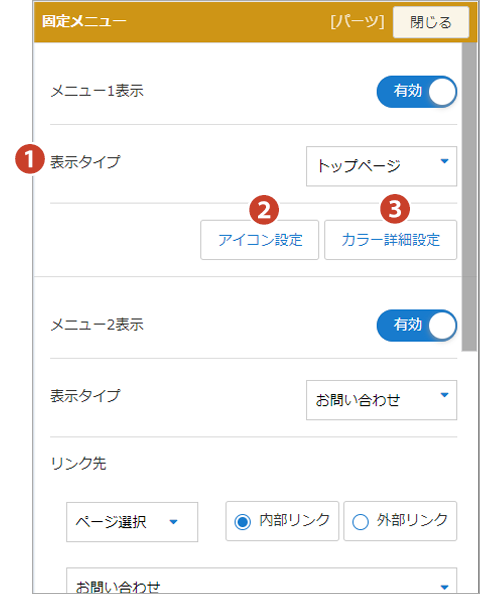 固定メニュー(スマホ画面) パーツ解説 スクロール中に画面下部へメニューボタンが固定して表示することができます。複数のメニューを設定でき、メニューの用途に合わせたアイコン(お問い合わせやご注文など)を表示できます。 パーツ編集モードについてはこちらメニュー設定 表示させるメニューは5件まで設定可能です。①表示タイプ表示するメニューボタンの用途を、"トップページ"、"メニュー"、"お問い合わせ"、"電話"、"資料請求"、"SNSシェア"、"限定公開ログイン"、"採用情報"、"アクセス"、"オリジナル"から選択できます。また、選択した用途によってボタンの設定内容が異なります。②アイコン設定メニューに表示させるアイコンの設定が行えます。③カラー詳細設定メニューの文字色、背景色の設定が行えます。 用途別の設定項目トップページ "トップページ"を選択すると、リンク先が自動的に「トップページ」に設定されます。 メニュー "メニュー"を選択すると、メニューボタンをタップした時にサイトメニューが表示されます。 お問い合わせ/資料請求/採用情報/アクセス お問い合わせ、資料請求、採用情報、アクセス を選択すると、リンク先設定欄が表示されます。リンク先を設定し、訪問者を誘導します。 電話 用途で"電話"を選択すると、電話番号入力欄が表示されます。電話番号を入力すると、スマホ公開画面のメニューをタップして登録された電話番号へ掛けることができます。 SNSシェア 用途で"SNSシェア"を選択すると、連携しているアカウントのSNS名が表示されます。チェックしたSNSはメニューをクリックするとサブメニューで表示され、設定しているアカウントへサイトをシェアすることができます。*外部サービス連携についてはこちら 限定公開ログイン "限定公開ログイン"を選択すると、リンク先が自動的に限定公開ログインページへと設定されます。 オリジナル ”オリジナル”を選択すると、メニュー名のテキスト入力欄とリンク入力欄が表示されます。電話番号入力を"有効"にすると、リンク入力欄が閉じて電話番号の入力欄が表示されます。また、”アイコン設定”内で、お手持ちの画像をメニューボタンとして設定することができます。