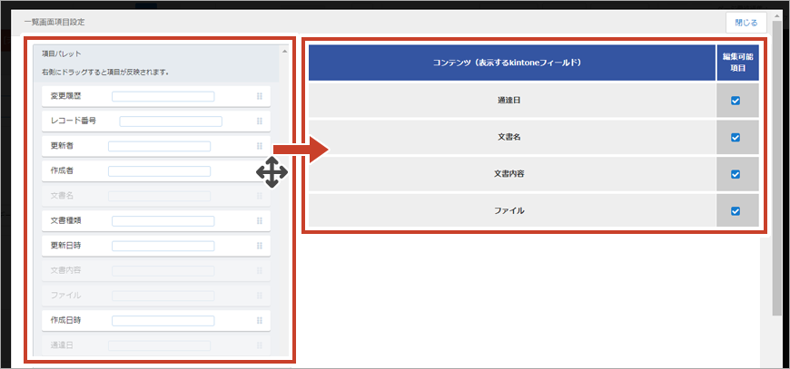 左側の"項目パレット"から表示させたい項目を "コンテンツ"にドラッグ&ドロップで配置して完了となります。