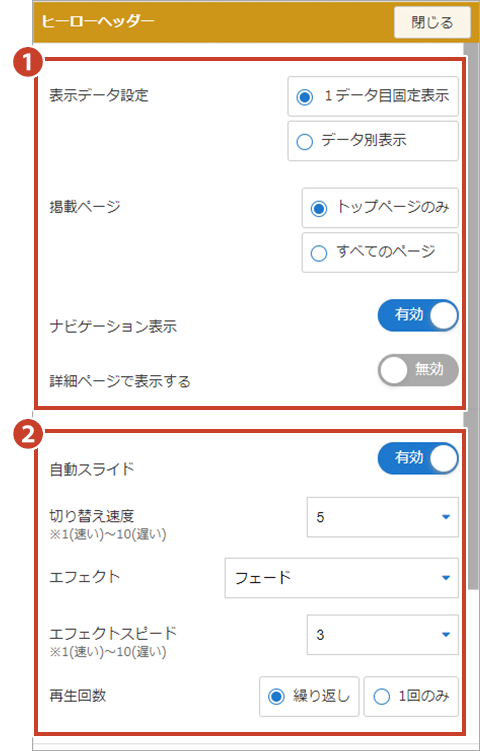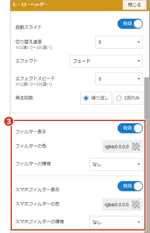 自動スライドを"有効"に設定すると、ヒーローヘッダーの画像を自動で切り替える設定を行えます。