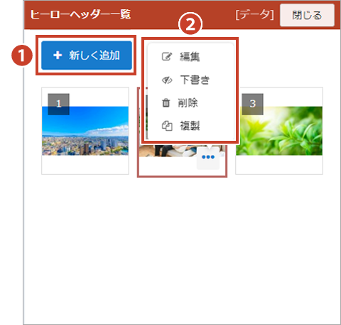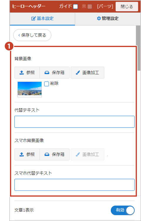 ヒーローヘッダーの背景に表示させるイメージを登録します。