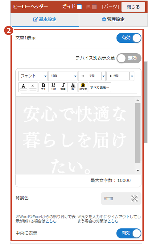 また背景色の設定や、「中央に表示」を "有効" にして文字を中央部分に配置できます。