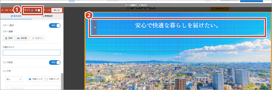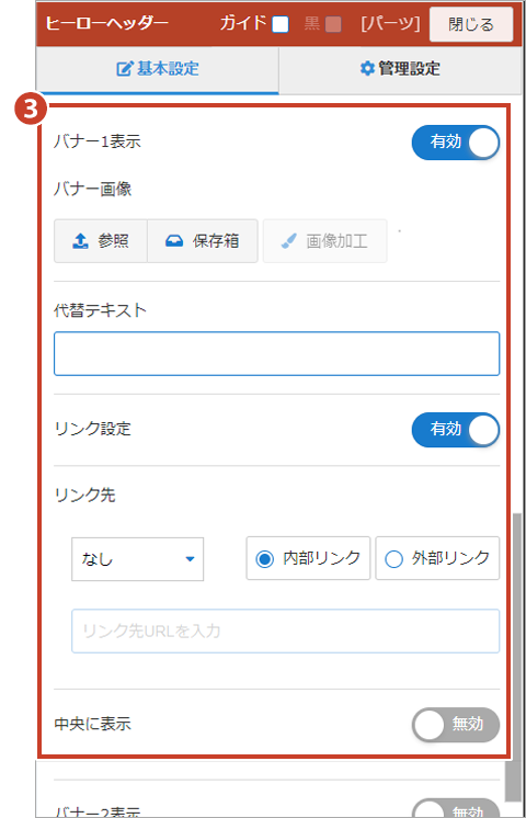 バナー画像を設定します。また代替テキスト(画像の代わりになる語句、文章)の設定も可能です。