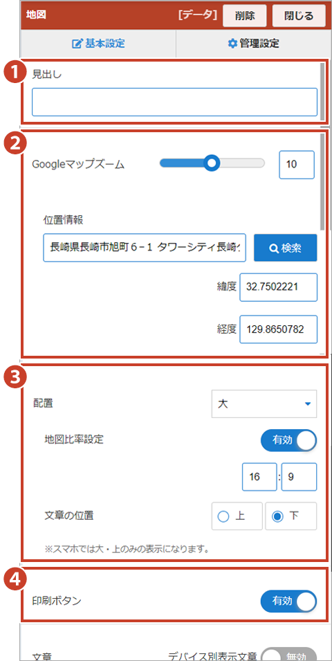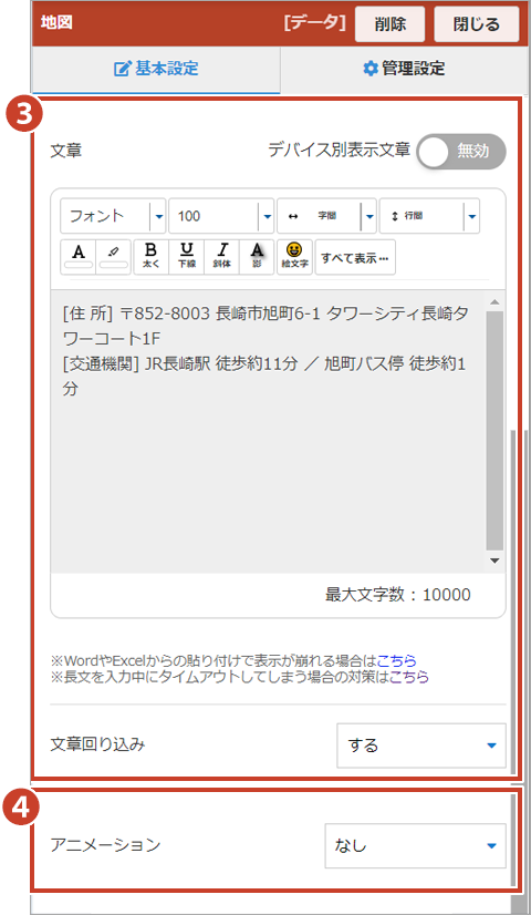 ③文章…… 表示させる文章をエディタに入力します。エディタ内では、文字色や背景色を変更したり、編集することができます。