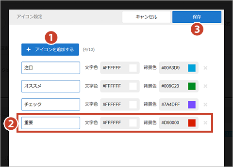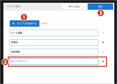 カテゴリ名を追加後、右上の ③「保存」ボタンをクリックします。