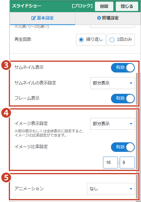 - サムネイル表示…有効にすると、スライドショー下部にサムネイルが表示されます。また、サムネイルの表示設定から、部分表示、全体表示から選択できます。