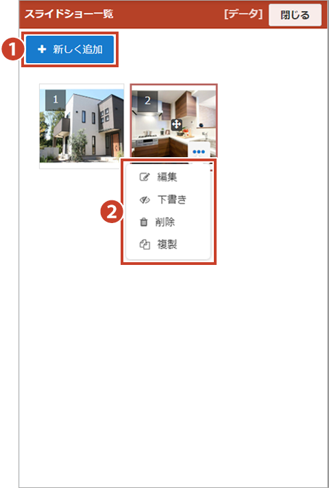 データ一覧で【新規追加】ボタン、または【編集】ボタンをクリックすると"データ編集"画面に移動します。