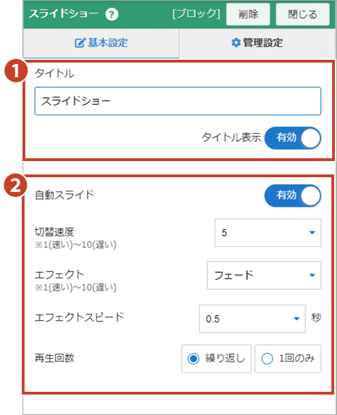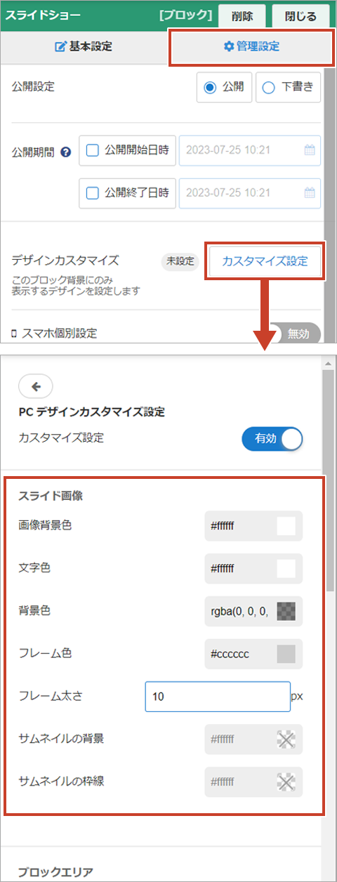 ブロック編集パネルの上部にある「管理設定」から、「カスタマイズ設定」を有効に設定して各種デザインの設定を行います。