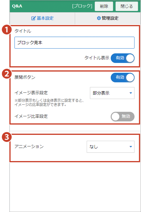 "有効"に設定すると、ブロック右上に【すべて開く】、【すべて閉じる】ボタンが表示されます。