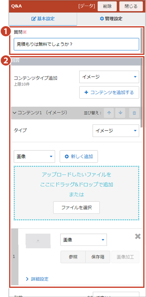 コンテンツタイプは、"イメージ"、"文章"、"文章+イメージ"、"ファイル"、"HTMLタグ" からタイプを選択し、コンテンツの並び替えを入れ替えることができます。