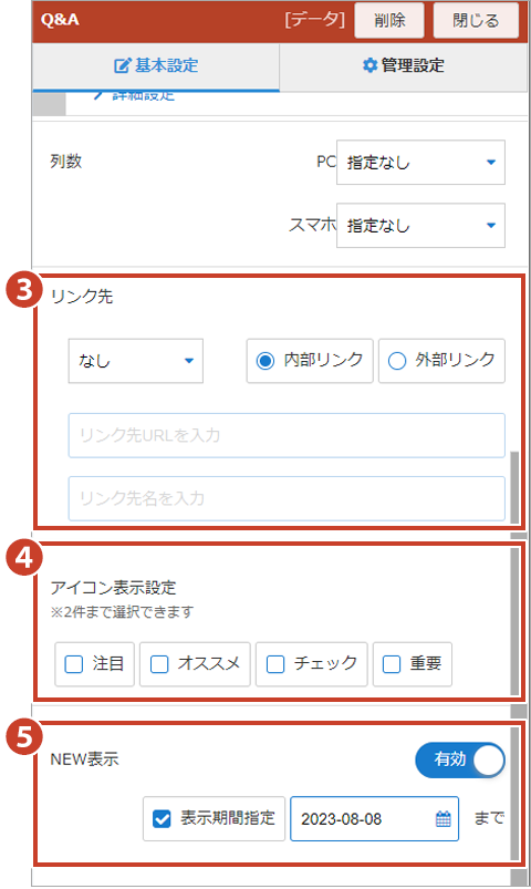 記事に表示させるアイコンの設定を行います。1つの質問につき、最大2件まで選択可能です。