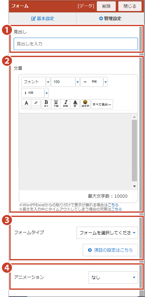②文章…… 表示させる文章をエディタに入力します。エディタ内では、文字色や背景色を変更したり、編集することができます。