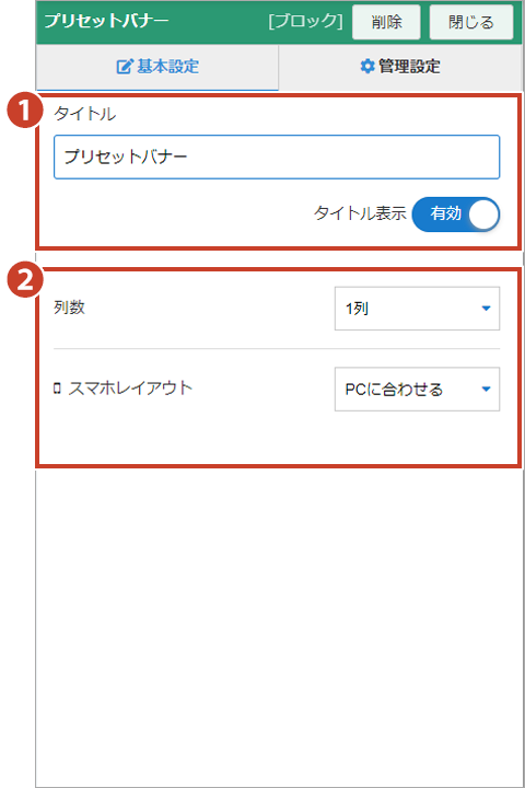 「バナー用途」から用途を選択すると、あらかじめ設定された文言やカラーが適用されて表示します。