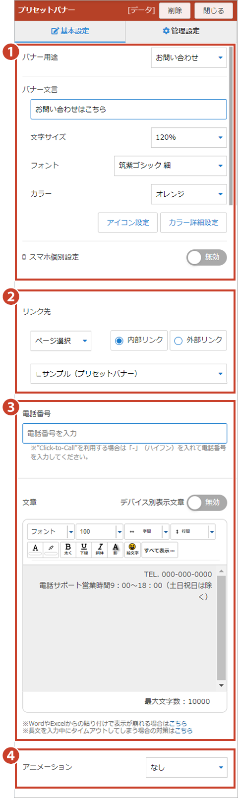 表示させる電話番号を入力したり、文章をエディタに入力します。エディタ内では、文字色や背景色を変更したり、編集することができます。
