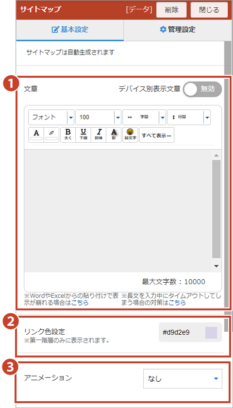ブロック・データ作成 ブロック作成(基本設定) タイトルタイトルを入力します。「タイトル表示」を ”無効” にすると、公開画面には表示されなくなります。 ブロック管理設定はこちらデータ作成(基本設定) ①文章文章を表示させる場合に入力します。デザインの下に表示されます。②リンク色設定第一階層のページ名の背景部分に設定するカラーを変更できます。③アニメーションコンテンツを表示する際のアニメーションを設定できます。 データ管理設定はこちら