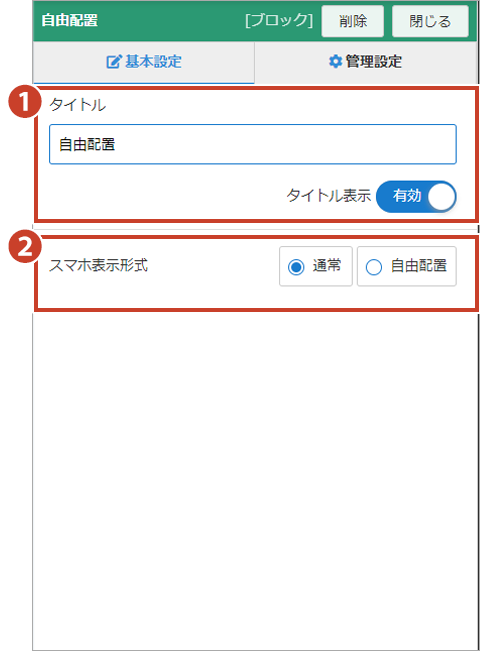 ブロック作成 ブロック作成(基本設定) ①タイトルタイトルを入力します。「タイトル表示」を ”無効” にすると、公開画面には表示されなくなります。②スマホ表示形式スマホ表示形式を「通常」、「自由配置」から選択します。通常配置 … 自動的に縦一列でコンテンツが表示されます。自由配置 … PCと同様にエリア内の自由配置にコンテンツを配置できます。 ブロック管理設定はこちら データ作成画面へ自由配置文章!!!!!!いぇあ!!!!!詳しくはこちら!!!!