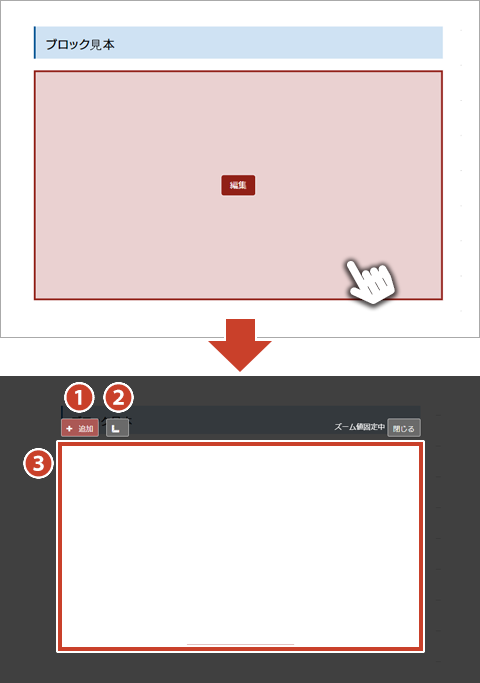 自由配置ブロックは他のブロックやデータの編集と異なり、データの編集エリアをクリックして編集モードにしてコンテンツの追加や保存などの操作を行います。