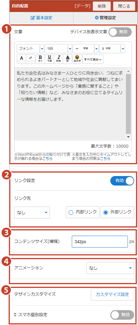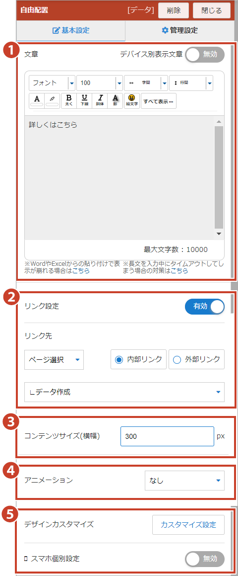 ①文章……ボタンのタイトルとなる文章を表示させる場合は、文章を入力します。
