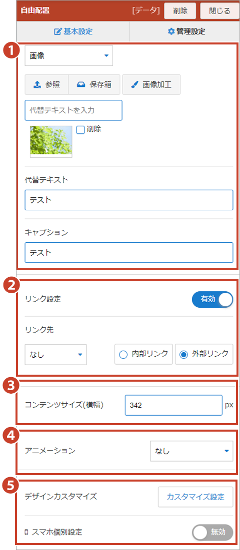①イメージ表示……メディアを選択して、イメージを登録します。