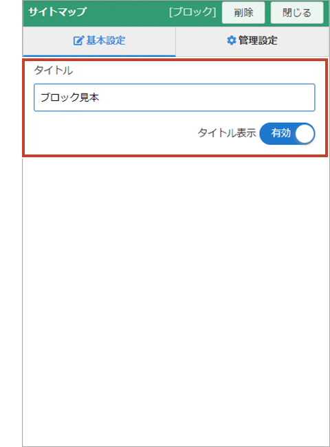 ブロック作成(目次ブロック) ブロック作成(基本設定) タイトルタイトルを入力します。「タイトル表示」を ”無効” にすると、公開画面には表示されなくなります。 ブロック管理設定はこちら データ作成画面へ目次見出し[非表示]ブロック作成(基本設定)ブロック管理設定はこちらデータ作成画面へ