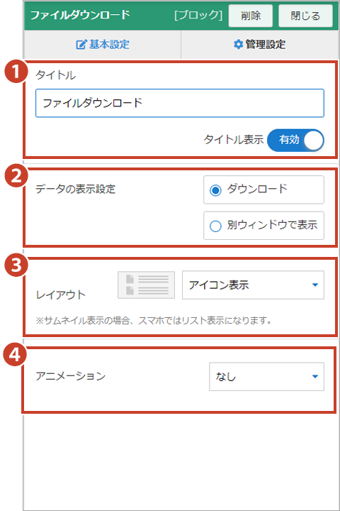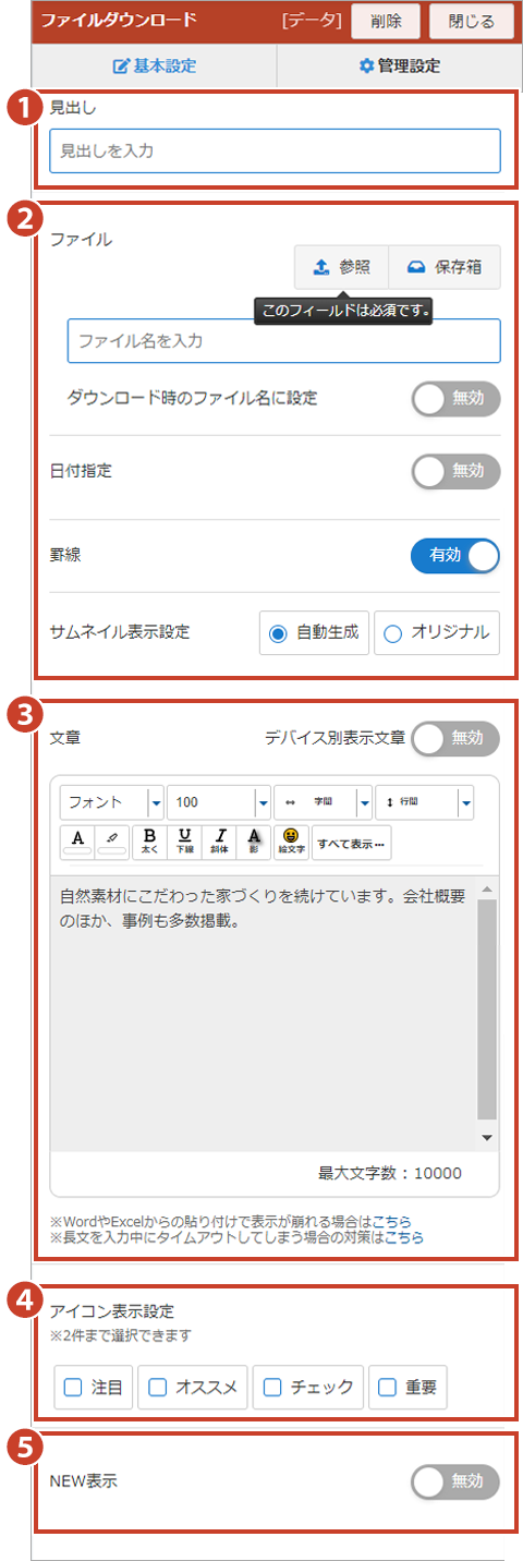 ファイルを登録し、表示させるファイル名を入力します。入力したファイル名を、ダウンロードした時のファイル名として設定することができます。