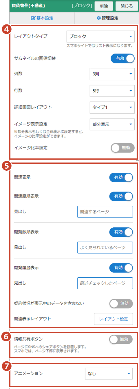 物件の詳細画面で、関連する物件を表示させる場合の順番や見出し、レイアウトを設定します。