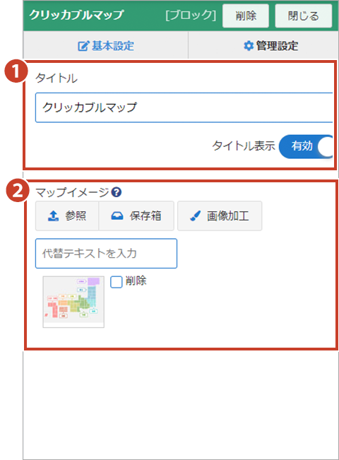 ブロック作成(クリッカブルマップ) ブロック作成(基本設定) ①タイトルタイトルを入力します。「タイトル表示」を ”無効” にすると、公開画面には表示されなくなります。②マップイメージクリッカブルマップの土台となるイメージを登録します。 ブロック管理設定はこちら データ作成画面へクリッカブルマップ いぇあ