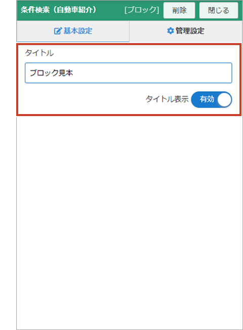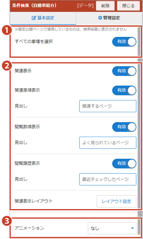自動車紹介の詳細画面に表示させる、関連表示設定を行います。見出しやレイアウトを編集できます。