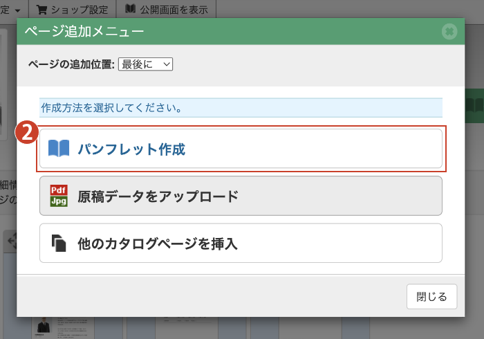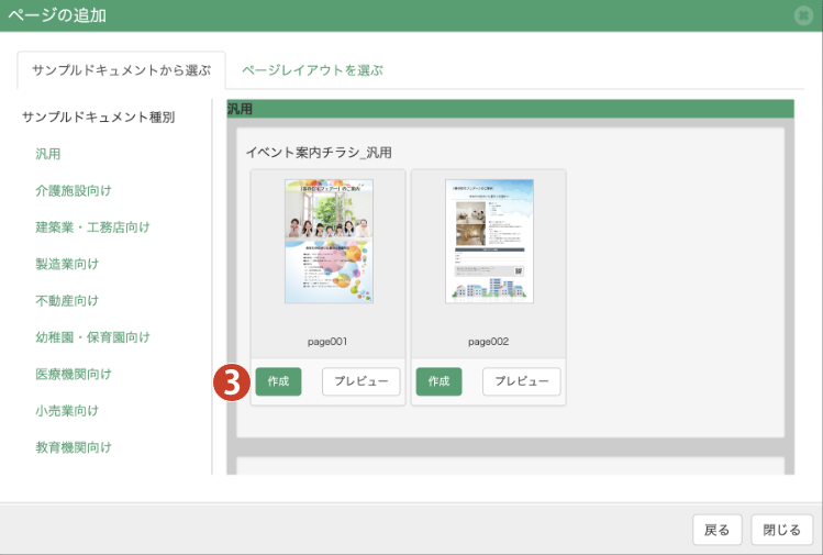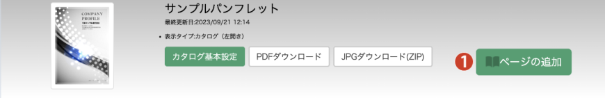 - サンプルドキュメントのページ一覧にて、追加したいページの③作成ボタンをクリックすると、デジタルカタログのページが追加されます。