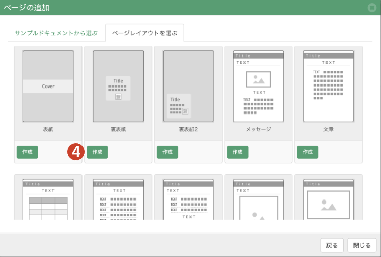 - 追加したいページレイアウトの④作成ボタンをクリックするとページが追加されます。
