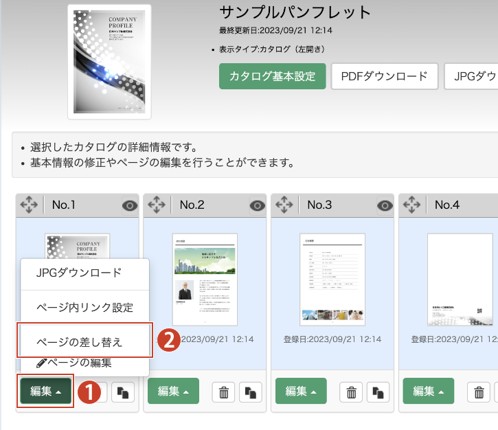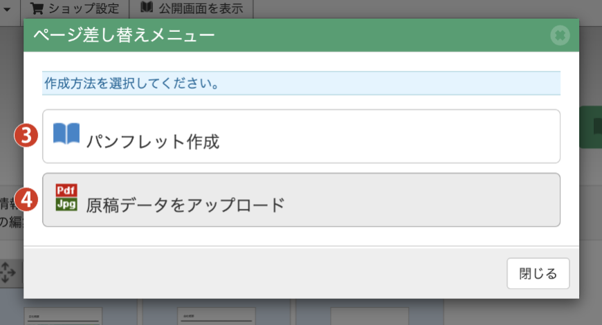 • ④原稿データをアップロードは、JPGまたはPDFファイルをアップロードしてページの差し替えを行います。操作については、ページ追加と同じです。詳しくは、こちらから