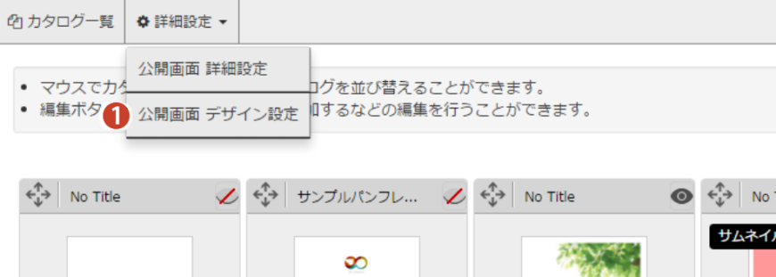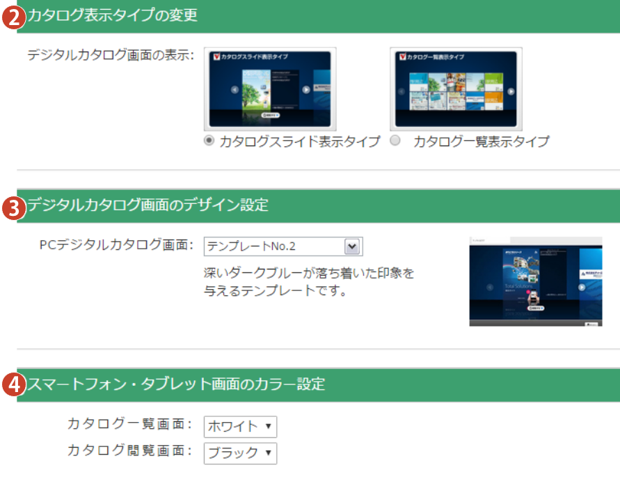 公開画面のデザイン設定 画面上部の詳細設定メニューの中から①公開画面 デザイン設定ボタンをクリックします。 ②カタログ表示タイプの変更:カタログの公開画面上での表示タイプを2タイプから選択し、変更します。③公開画面のデザイン設定:公開画面のデザインテンプレートを変更できます。④スマートフォン・タブレット画面のカラー設定:カタログ一覧画面とカタログ閲覧画面のそれぞれのカラーを「ブラック」「ホワイト」から選択し、変更できます。設定後は、保存を行ってください。