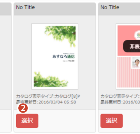 - カタログの一覧から商品を登録したいカタログの②選択ボタンをクリックします。