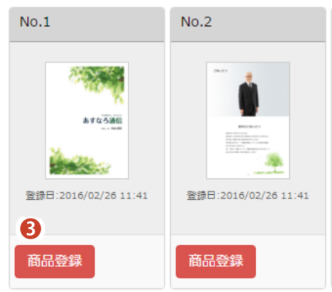 - ページの一覧から商品を登録したいページの③商品登録ボタンをクリックします。
