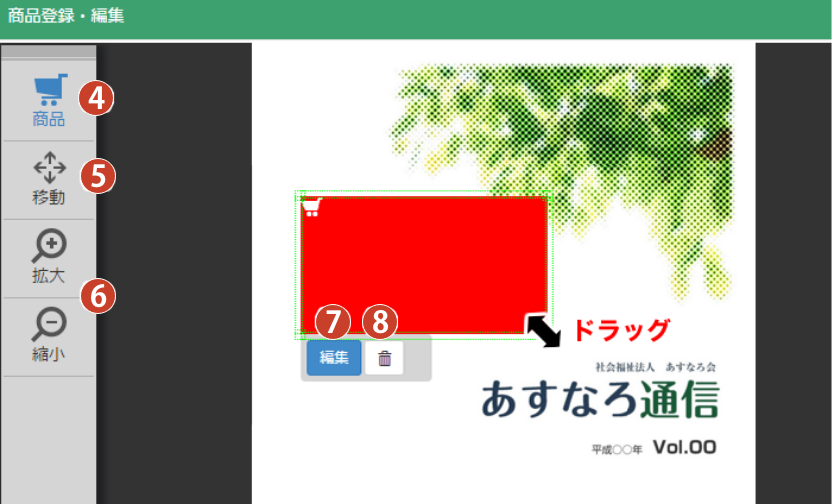 - ④商品ボタンで商品情報を貼ります。ページ上をドラッグして範囲を設定します。