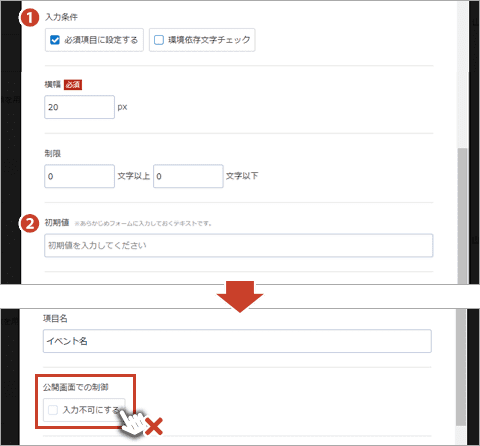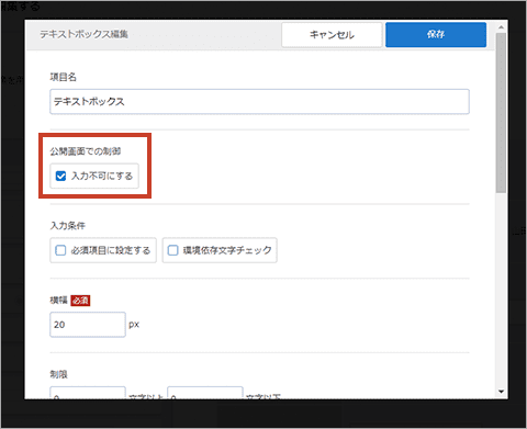 ②公開画面での制御……項目を入力不可に設定して、閲覧者がフォームに入力できないように設定できます。
