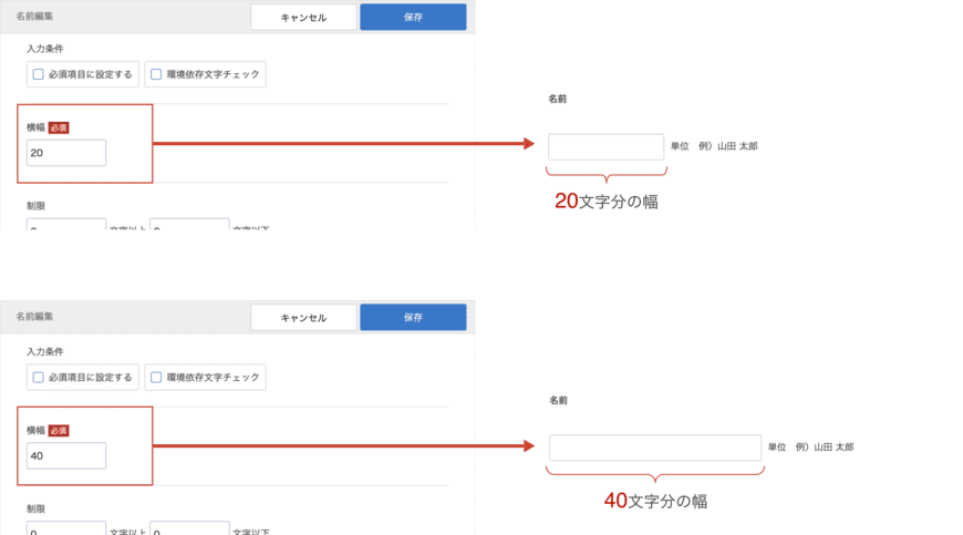 テキストボックス・テキストエリア・メールアドレス・住所で設定できる「横幅」は、入力欄の幅を文字数で指定します。