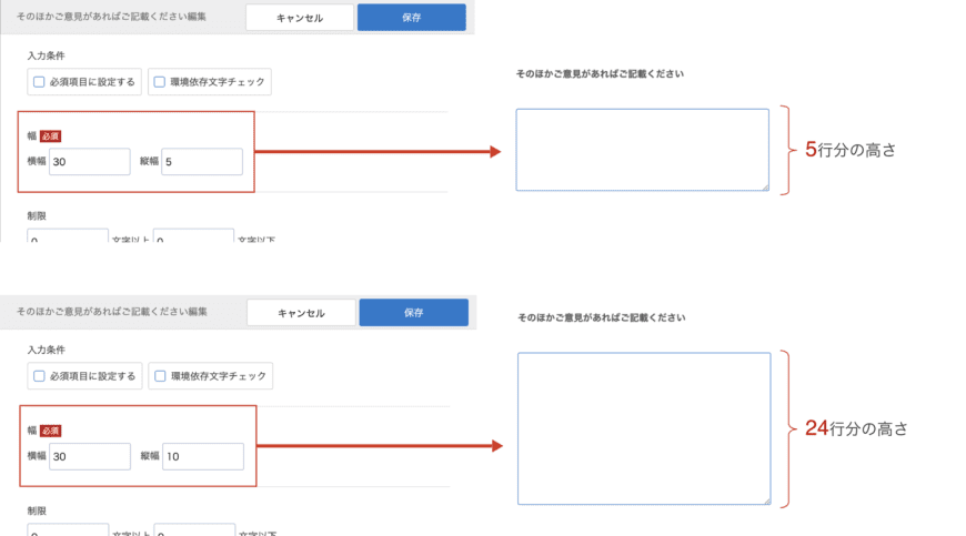 テキストボックス設定できる「縦幅」は、入力欄の高さを行数で指定します。